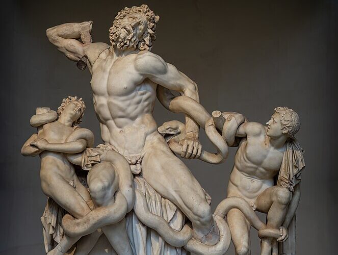 The statue of Laocoön and His Sons is a famous ancient Greek sculpture depicting the Trojan priest Laocoön, his two sons, and a sea serpent. It’s one of the most renowned ancient sculptures and is housed in the Vatican Museums in Vatican City.